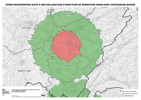 Cette ZR5 concerne les départements : Ain, Saône-et-Loire, Jura, Rhône et Isère. Les bovins détenus en ZR5 seront vaccinés contre la DNC.