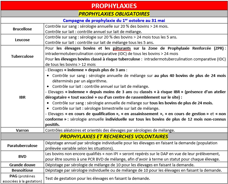 Pour les élevages laitiers livrant en laiterie de manière continue, les analyses sont effectuées sur lait de grand mélange (LGM). Pour les autres élevages laitiers (producteurs fermiers ne livrant pas en laiterie, production discontinue…) et les élevages allaitants, les analyses se font sur prise de sang (PS). Pour les interventions fractionnées, l’écart entre le début et la fin de prophylaxie ne doit pas excéder 90 jours. Sauf cas de force majeure notifié à la DDETSPP23, les qualifications des cheptels pour lesquels la prophylaxie ne sera pas faite ou terminée au 31 mai 2026 pourront être suspendues jusqu’à la réalisation des actions correctives et à défaut, les cheptels seront déqualifiés (2 prophylaxies seront exigées pour être requalifié).
