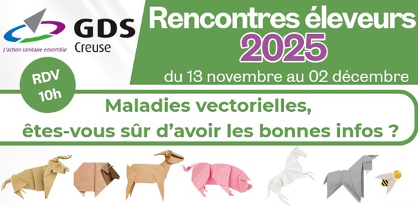 Réunions d’information GDS Creuse : Dans un contexte de désinformation croissante sur les réseaux sociaux et internet, il est plus que jamais essentiel d’avoir accès à des informations réglementaires, objectives et rationnelles, indispensables à la conduite sanitaire de vos élevages. Venez nous retrouver lors de nos réunions du 13 novembre au 2 décembre 2025.