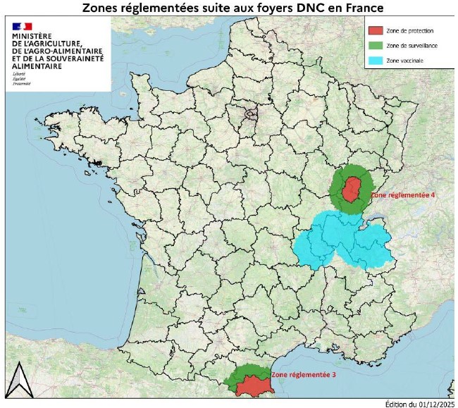 La circulation du virus, en relation avec des déplacements d’animaux illégaux ou intervenus juste avant la découverte des foyers, a entrainé la constitution de 5 zones réglementées. À ce jour, 7 départements ont été touchés et on recense 108 foyers dans 73 élevages, un foyer correspondant à une unité épidémiologique (un lot au champ ou un bâtiment). Dans 2 zones réglementées, on a retrouvé encore récemment de nouveaux foyers, signe d’une circulation virale qui n’est pas encore sous contrôle. En revanche, aucune déclaration de foyer n’a été enregistrée depuis plus de 45 jours dans 3 zones réglementées. Du fait d’un taux de vaccination très élevé, elles ont pu passer en zone vaccinale DNC, avec une évolution des mouvements à la clé.